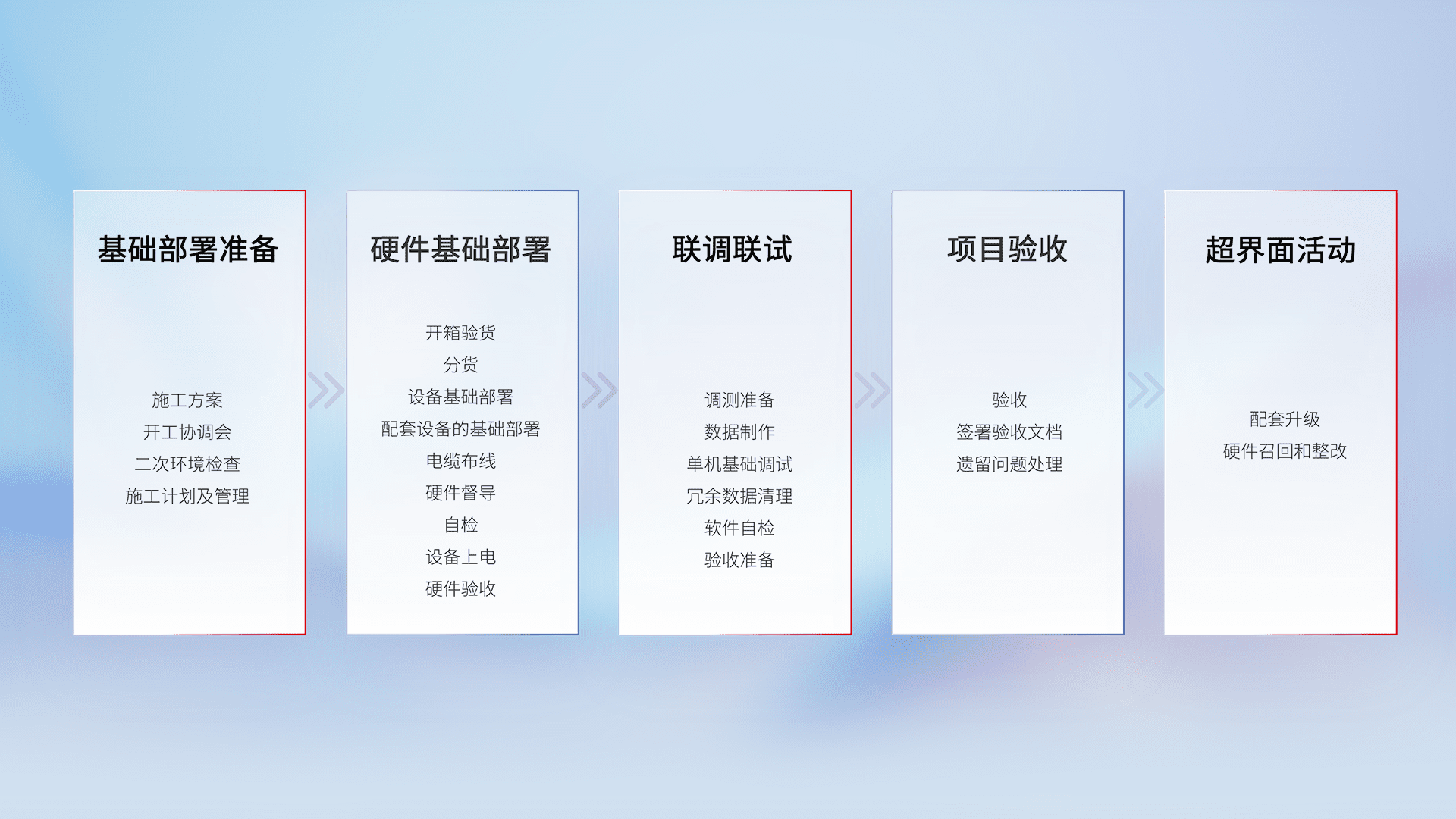 从基础部署准备、、硬件基础部署、、联调联试、、、项目验收、、、越界面活动的全过程可追溯,,保证施工质量和进度。。。。